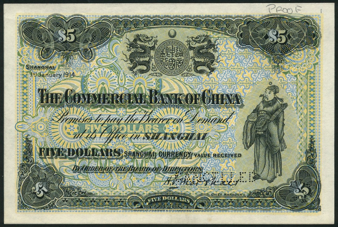 Commercial Bank of China, specimen $5, Shanghai, 1 January 1914, serial number C/A 000001-C/M 130000, black, pale blue, pale green and orange, seal flanked by a dragon top left and right, value left centre and at each corner, Confucius standing low right, signature of Marshall low centre, reverse similar to obverse but pale red, green,blue and yellow, Chinese text