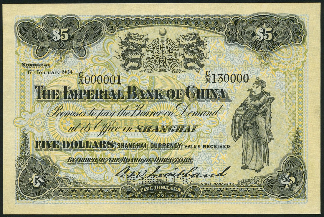 Imperial Bank of China, specimen $5, Shanghai, 16 February 1904, serial number C/A 000001-C/M 130000, black, pale blue, pale green and orange, seal flanked by a dragon top left and right, value left centre and at each corner, Confucius standing low right, large signature of Maitland low centre, reverse similar to obverse but pale red, green,blue and yellow, Chinese text