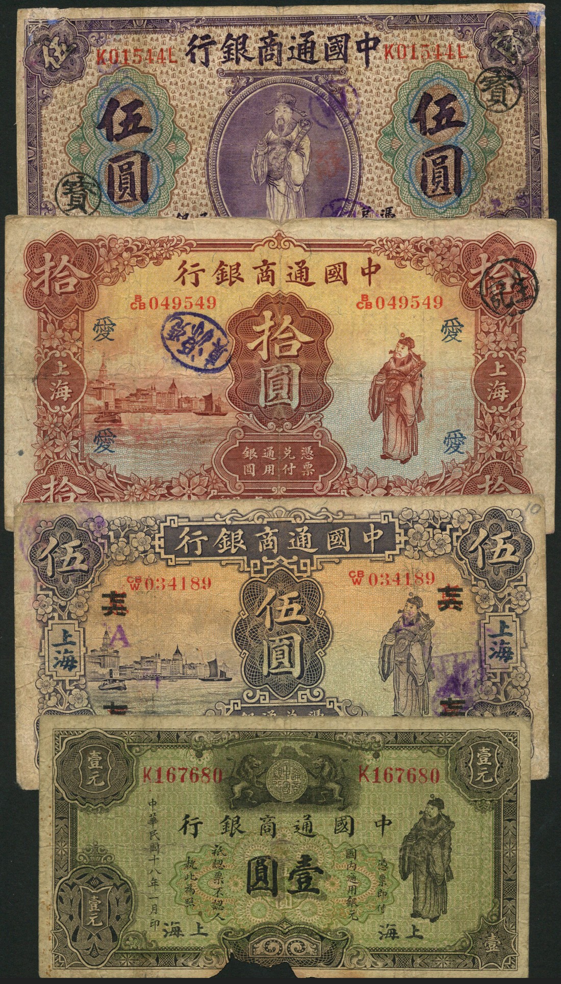 Commercial Bank of China, $1, Shanghai, 1929, red prefix K, green and black, $5, Shanghai 1920, red prefix K, purple, $5, Shanghai, 1932, red prefix CB/W, purple, $10, Shanghai, January 1926, brown, all the God of Wealth in field