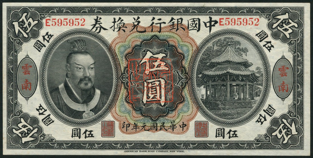 Bank of China, $5, Yunnan, 1 June 1912, red serial number E 595952, black, green, white and red and brown, Emperor Huang-Ti at left, pagoda at right, reverse brown and white, canal lock at centre