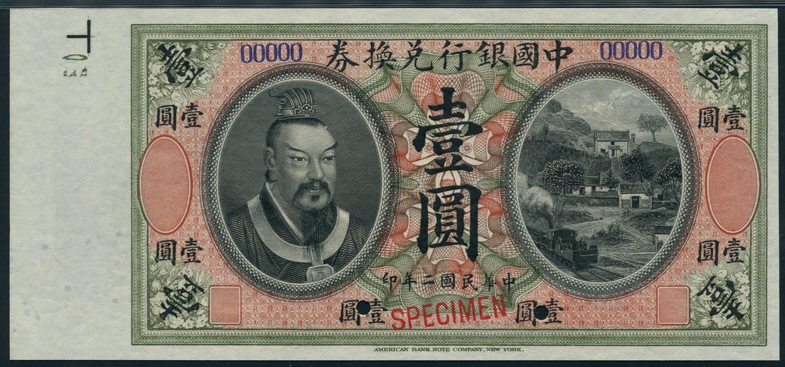 Bank of China, specimen $1, 1 June 1913, blue serial number 00000, no place of issue, pink, black and green, Emperor Huang-Ti at left, train, houses and hill at right, reverse reverse red-orange, canal flanked by avenue of trees at centre, value at left and right and at each corner