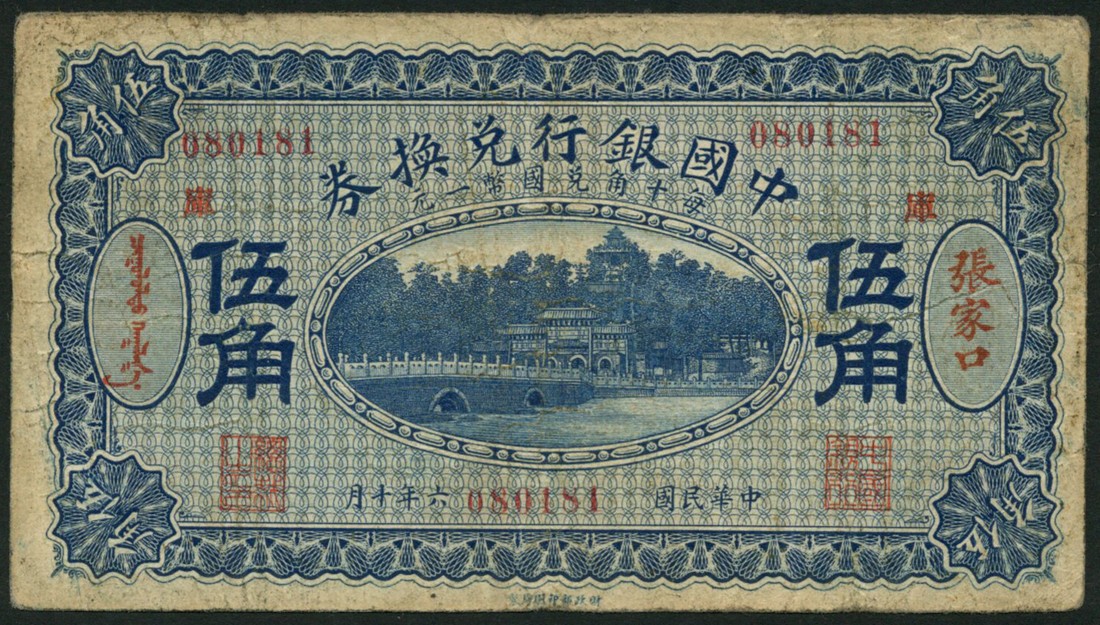 Bank of China, 50 cents, 1917, blue, pagoda and bridge at centre in oval frame, reverse orange-brown, KALGAN in Cyrillic low centre