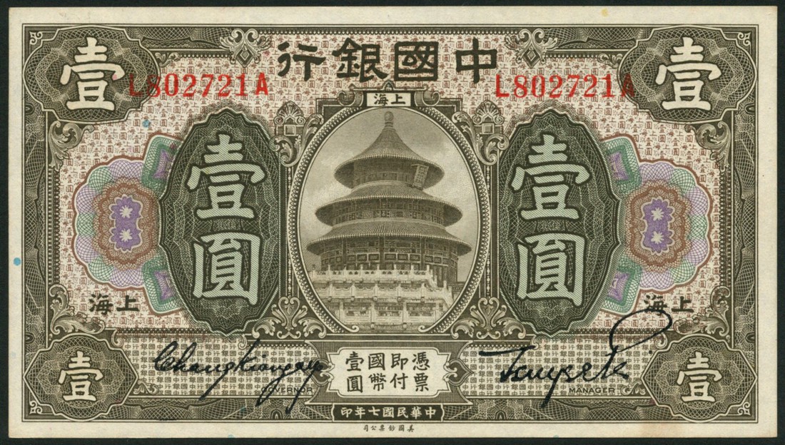Bank of China, 1 yuan, Tientsin, 1918, brown and multicoloured, the Temple of Heaven at centre , reverse brown, value, also 1 yuan, 1918, Shanghai, olive and multicoloured, reverse blue