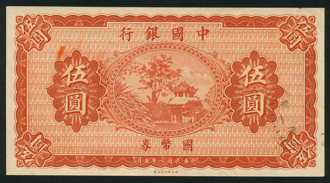 Bank of China, 5 yuan, 1919, ND, no serial number orange, pavillion at cente, reverse purple on pale orange, no signatures or place name,