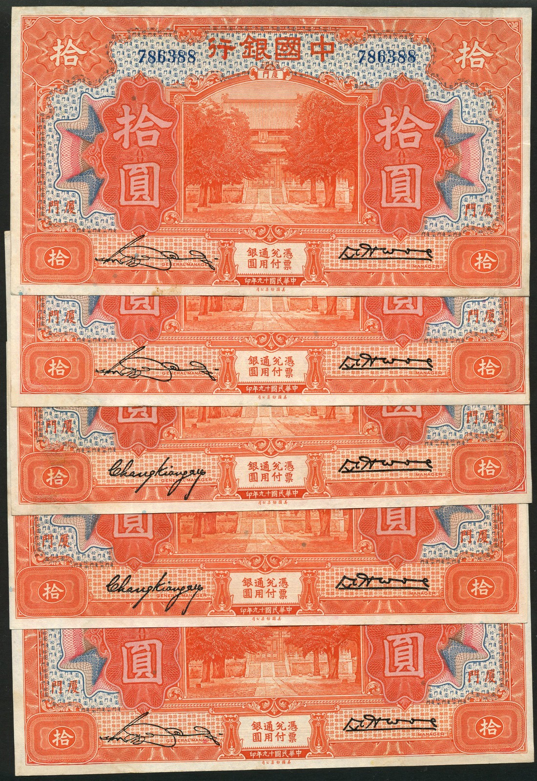 Bank of China, $10 (5), Amoy, 1930, blue serial numbers, red-orange and pale blue, house and path at centre, reverse red-orange