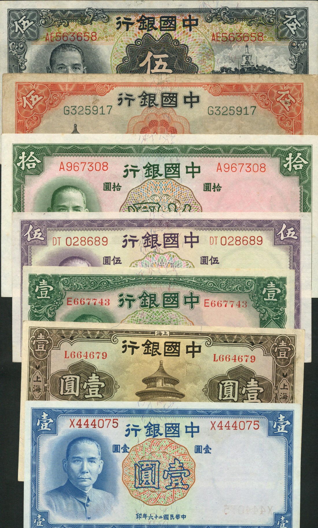 Bank of China, a miscellaneous group comprising 1 yuan (2), 1935, 1 yuan (2), 1936, 5 yuan (2), 1931 and 1935, Sun Yat Sen portrait 1 yuan (2), 1937, 5 yuan (4), 1937, 10 yuan (6), 1937