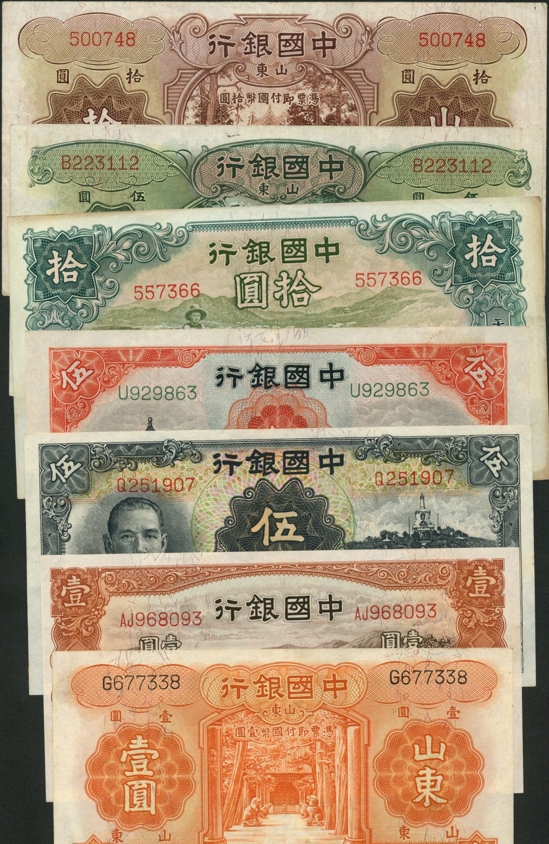 Bank of China, 5 yuan (2), 1935, black, Sun Yat sen at left, 1,5 and 10 yuan, Shantung, 1934/,1935 and 1,5 and 10 yuan, Tientsin, 1935,1931, and 1934 respectively