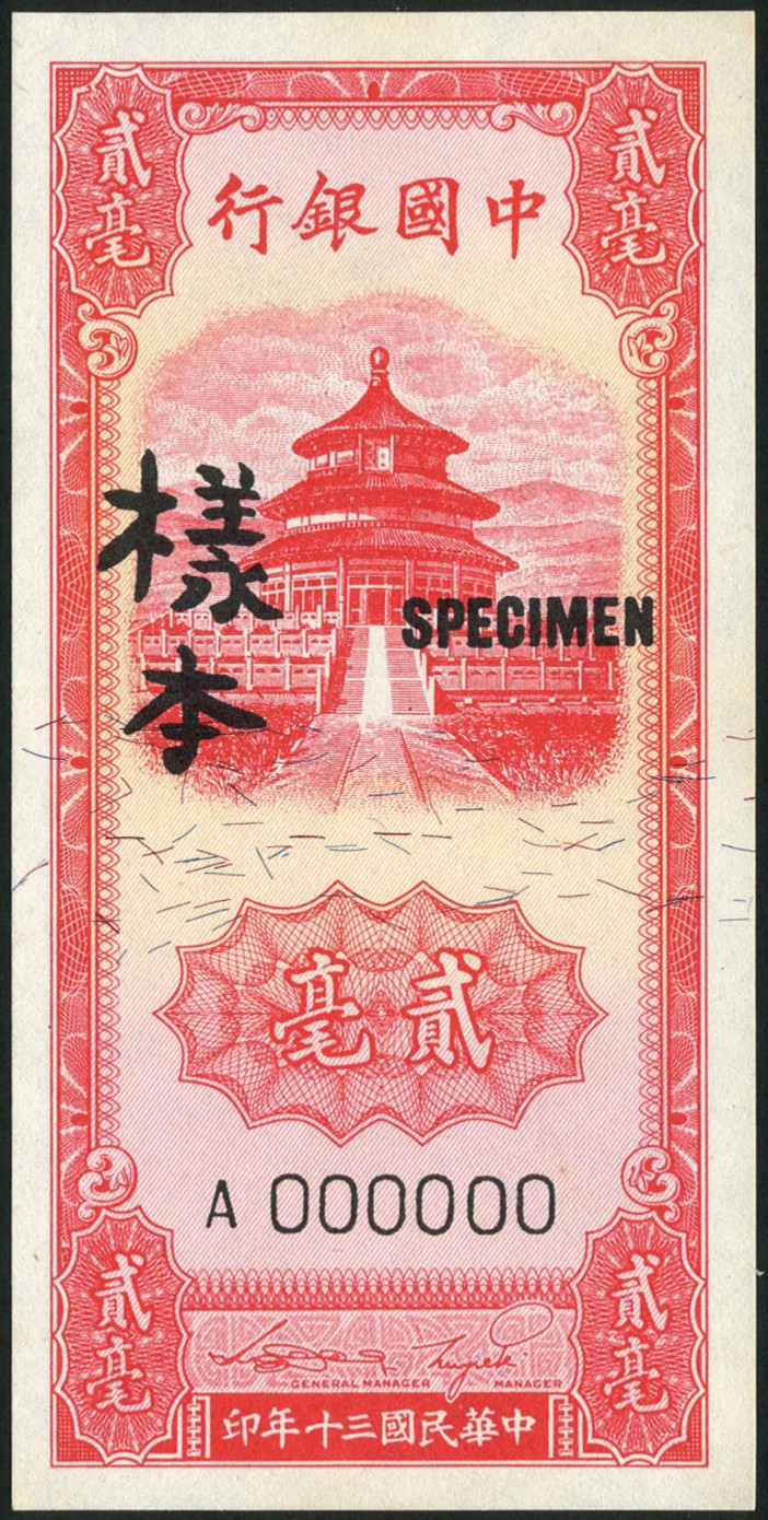 Bank of China, specimen uniface 20 cents, 1941, black serial number A 000000, red and pale orange-yellow, the Temple of Heaven top centre