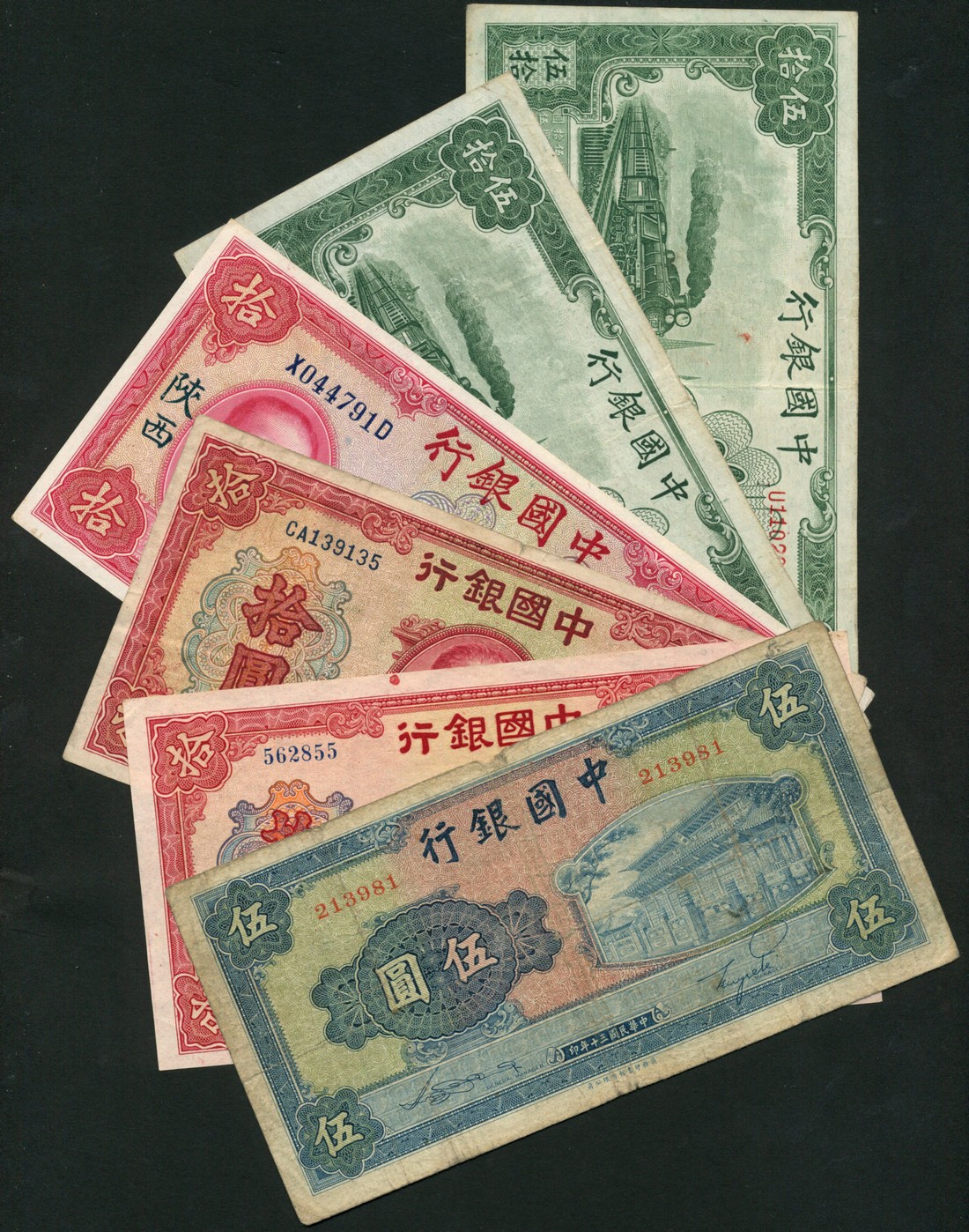 Bank of China, a miscellaneous group comprising 10 yuan (3), 1940 'SHENSI PROVINCE' ,1941 (2),red, 50 yuan (2), 1942, green, 1 yuan , 1941, blue