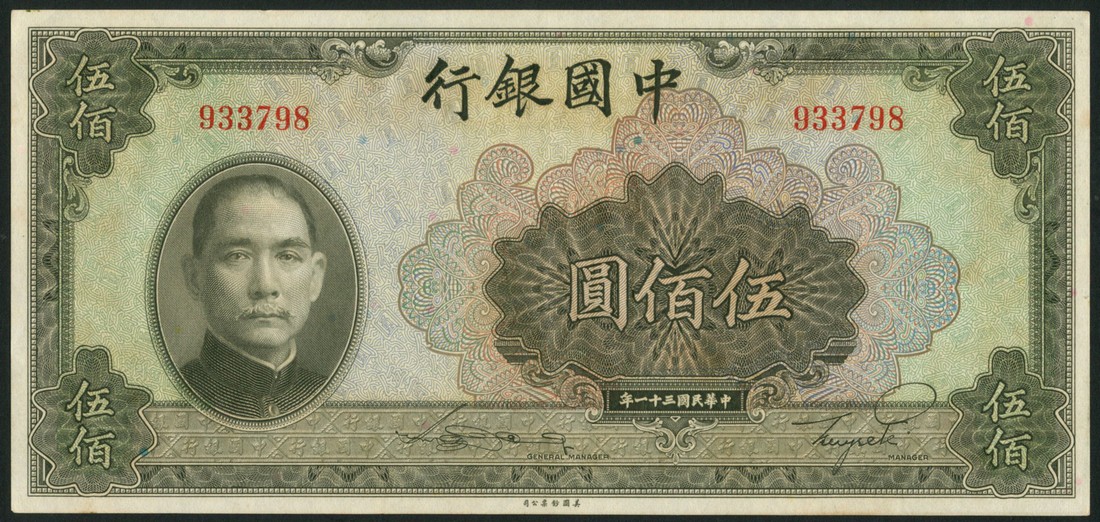 Bank of China, 500 yuan, 1942, red serial number 933798, olive green and multicoloured, Sun Yat Sen at left