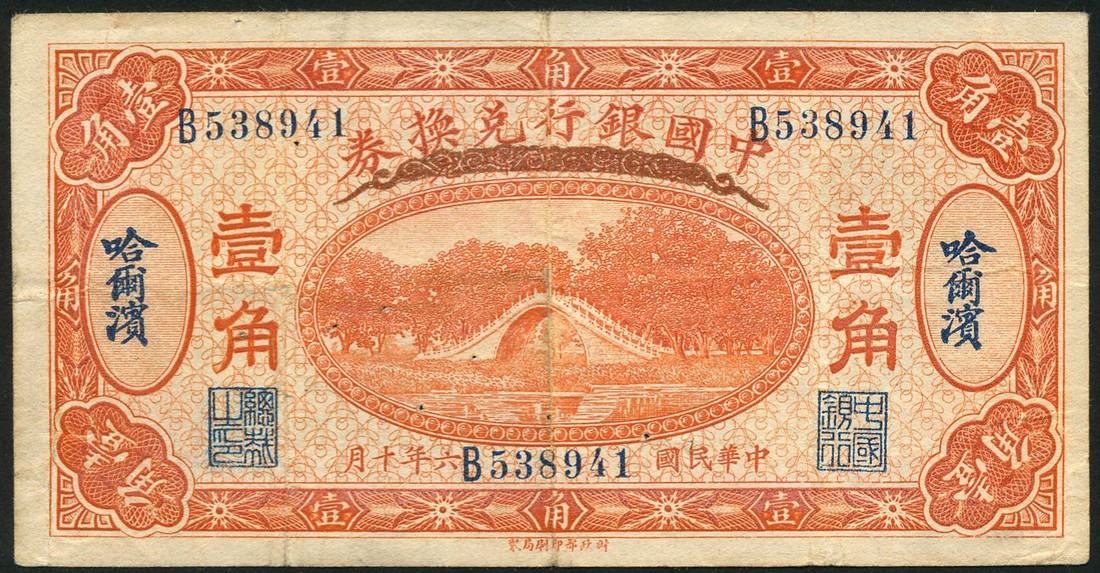 Bank of China, lot of 5 notes, mainly fractionals, 1 jiao Harbin 1917, 5 fen Harbin 1918, 1 jiao Shanghai/Harbin 1918, 2 jiao Shanghai 1925 and 1 yuan Shanghai 1918,