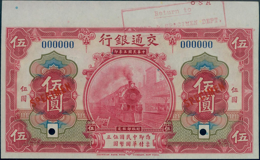 Bank of Communications, specimen 5 yuan, 1914, blue zero serial numbers, red on multicolour underprint, railway train at centre, value at left and right and in each corner, reverse bank building at centre