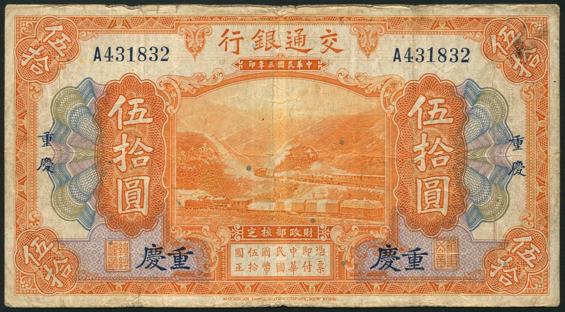 Bank of Communications, 5 yuan (2), Chungking, 1914, 10 yuan, 50 yuan (2) and 100 yuan, all 1914, Chungking issue