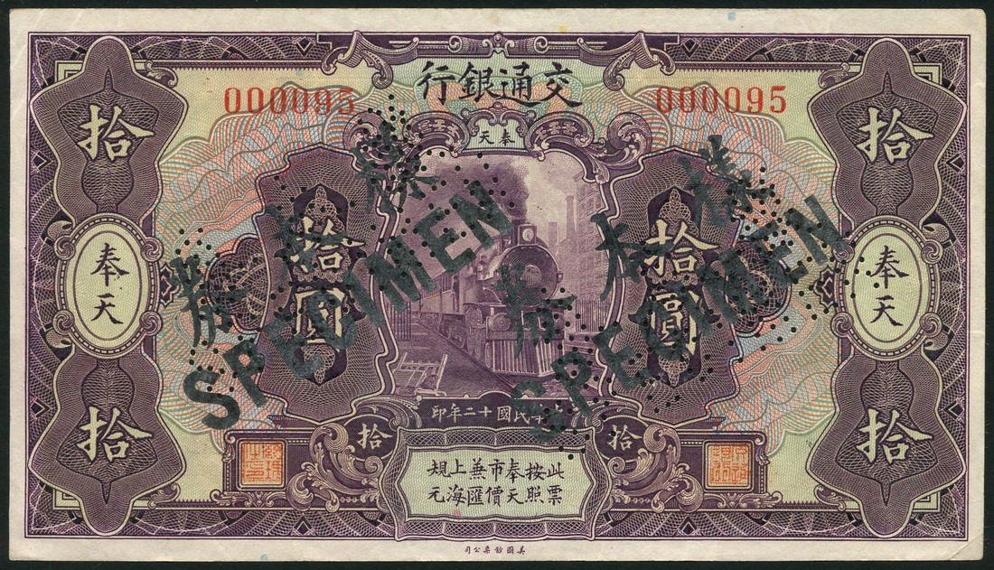 Bank of Communications, specimen 10 yuan, Fengtien, 1923, red serial number '000095', purple on multicoloured underprint, train at centre, 'specimen' overprinted in black in English and Chinese, reverse purple with bank building at centre,