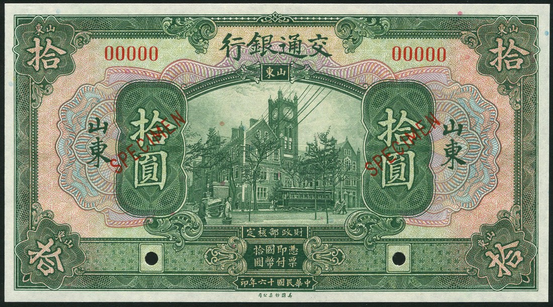 Bank of Communications, specimen 1 yuan, orange, specimen 5 yuan, purple, 10 yuan, green, all Shantung, 1 November 1927, first two locomotive at centre, 10 yuan tram and houses