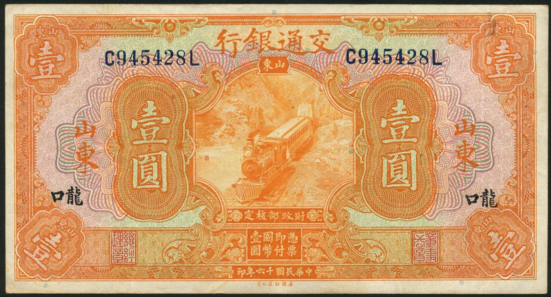 Bank of Communications, 1 yuan, Shantung,, 1927, orange, 5 yuan (2), Shantung, 1927, purple, black CHEFOO overprint at left and right on one example only