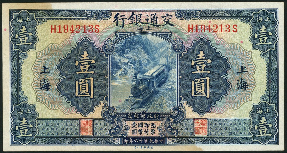 Bank of Communications, 1,5 and 10 yuan, Shanghai, 1927, blue, brown and red respectively