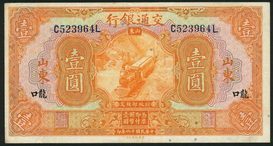 Bank of Communications, a selection comprising 1 yuan, Shanghai, 1927, blue, specimen and issued 1 yuan, Shantung, 1927, orange and a 1 yuan, 1927, orange with LUNGKOW overprint