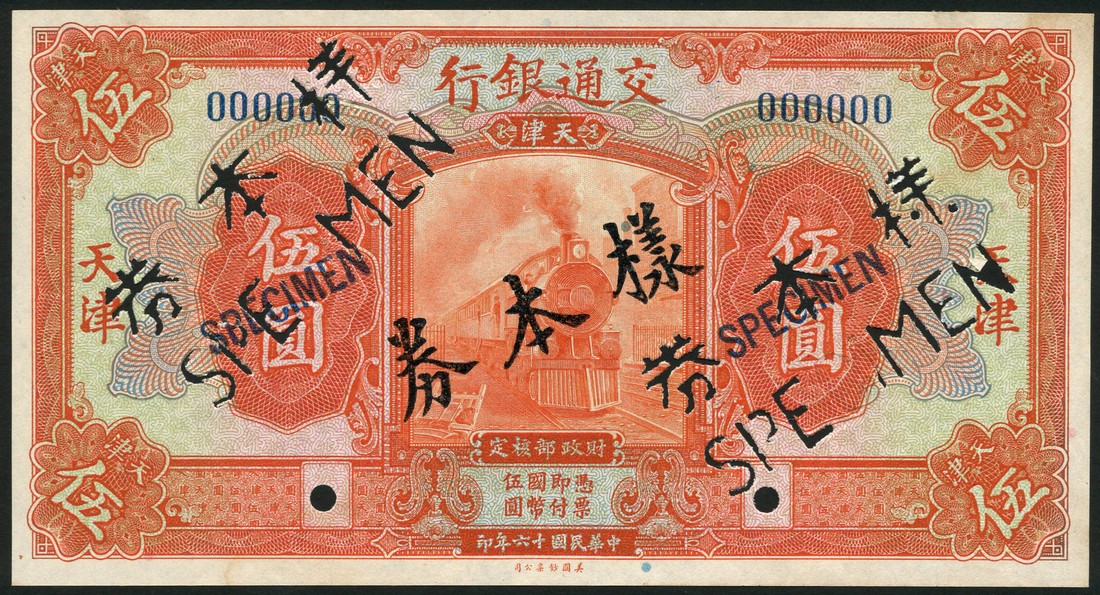 Bank of Communications, uniface obverse and reverse specimen 5 yuan, 1927, serial number 000000, orange on multicolour underprint, steam train at centre, black "specimen" stamp right and left and hole punched in both English and Chinese,