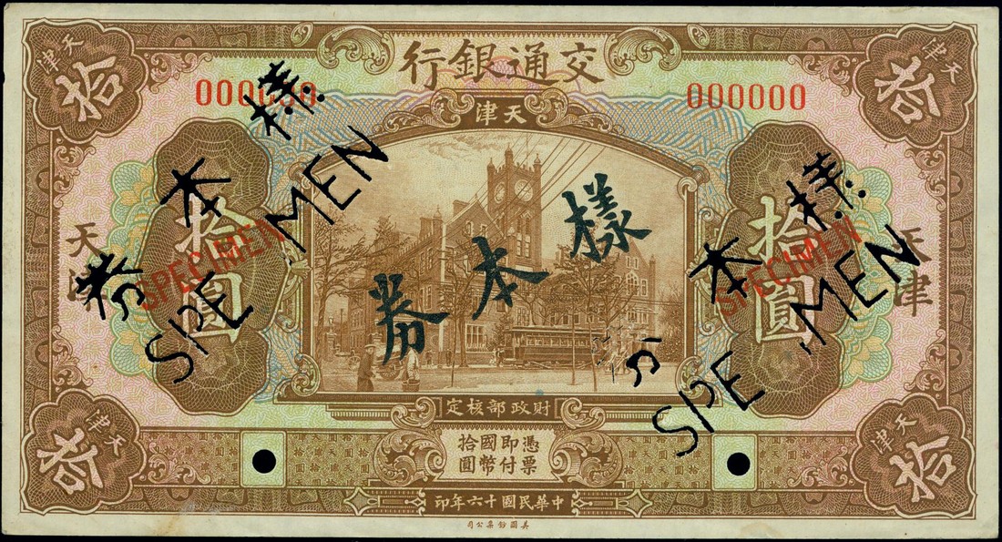Bank of Communications, $10, Tientsin, 1927 uniface specimen of the obverse, serial number '000000', brown and green and pink, Maritime Customs building at centre, hole punch cancelled with 'Specimen' overprinted in black Chinese characters