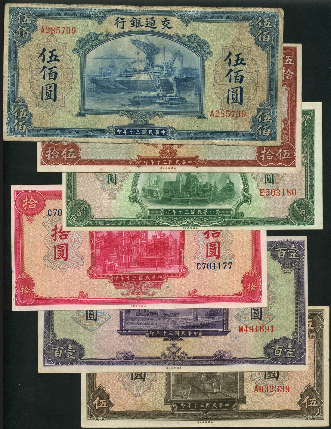 Bank of Communications, 5,10,25,50,100 and 500 yuan, 1941, (Pick 156,158,160,161b,162b,163a), generally good very fine, te 500 yuan almost fine and rare (6)