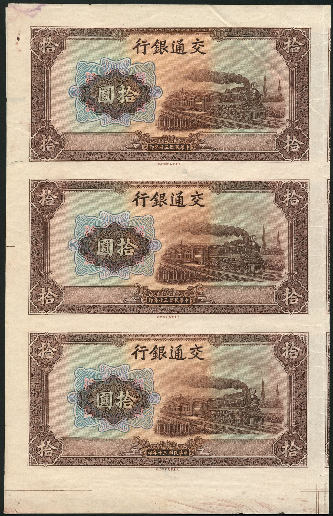 Bank of Communications, uncut sheet of 6 specimen/proof 10 yuan, 1941, no serial number, brown, train at right, reverse brown,