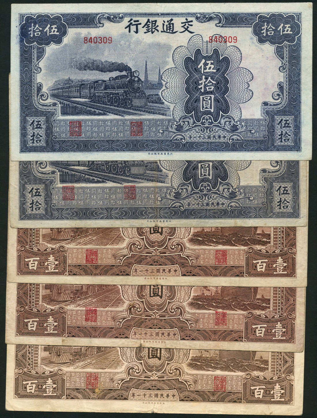 Bank of Communications, 50 yuan (2), 1942, purple, locomotive, also 100 yuan (3), brown, locomotive at left, steamship at right
