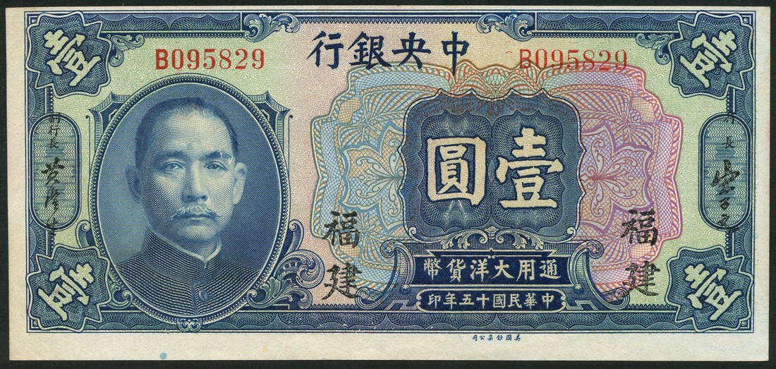 Central Bank of China, $1, Fukien, 1926, red prefix B, blue and multicoloured, Sun Yat Sen at left
