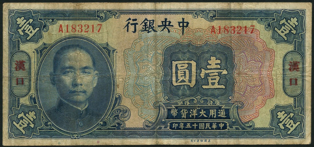 Central Bank of China, $1, Hankow, 1926, red prefix A, blue and multicoloured, Sun Yat Sen at left, also 50 cents, 1927, orange and white, the Temple of Heaven at centre