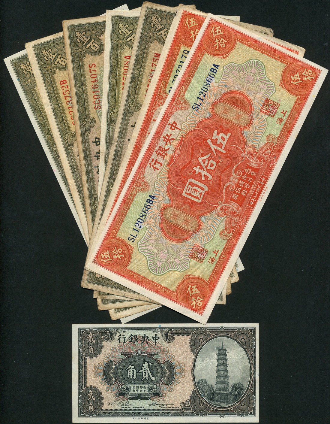 Central Bank of China, a group comprising 20 cents, 1924, 50 yuan (2), Shanghai, 1928, orange, Sun Yat Sen at centre on reverse, also 100 yuan (5), Shanghai, 1928, olive, Sun Yat Sen at centre on reverse