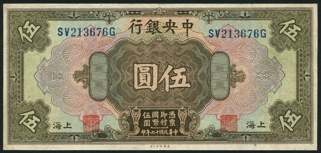 Central Bank of China, $5, Shanghai, 1928, blue prefix SV, green and multicoloured, signature 8