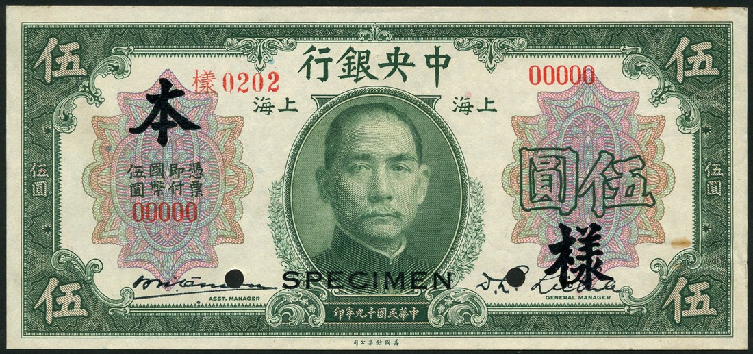 Central Bank of China, specimen 1 yuan, 1936, red zero serial numbers, 'Specimen' overprinted in blue Chinese characters, red and black with Pai Fang at right, uniface obverse only,also a uniface obverse and reverse specimen 5 yuan, 1930, green and white, Sun Yat Sen at centre, reverse green with Sun Yat Sen Mausoleum at centre