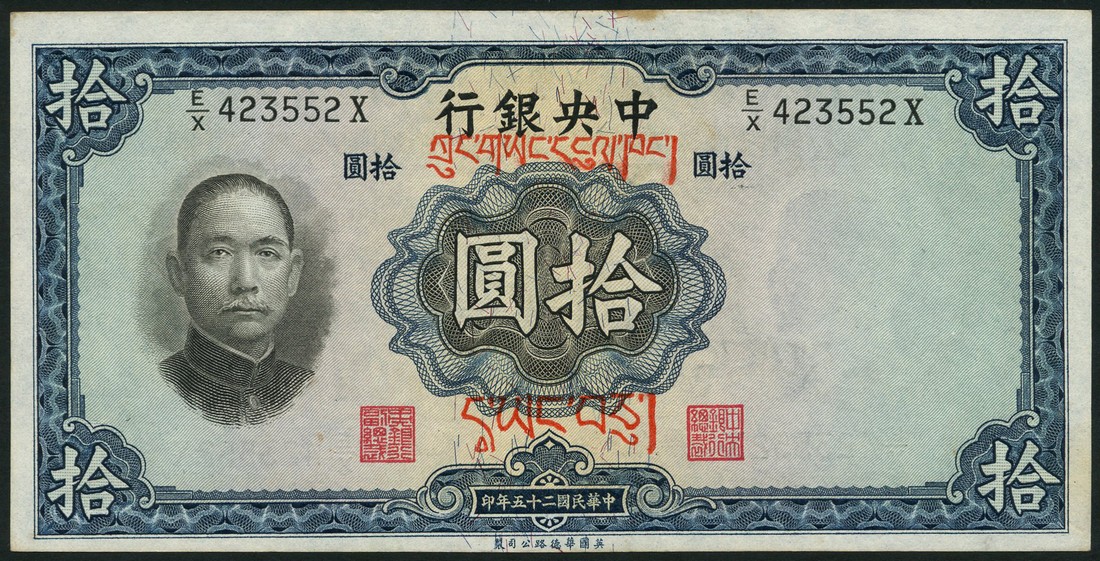 Central Bank of China, 'Tibetan overprints', 5 yuan, 1936, green and 10 yuan (2), 1936, blue, all sun Yat Sen at left and red Tibetan script on obverse and black Tibetan script on reverse