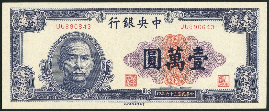 Central Bank of China, 20 cents, 2 and 5 yuan, 1941, 5000 yuan and 10000 yuan (2), all Sun Yat Sen portrait