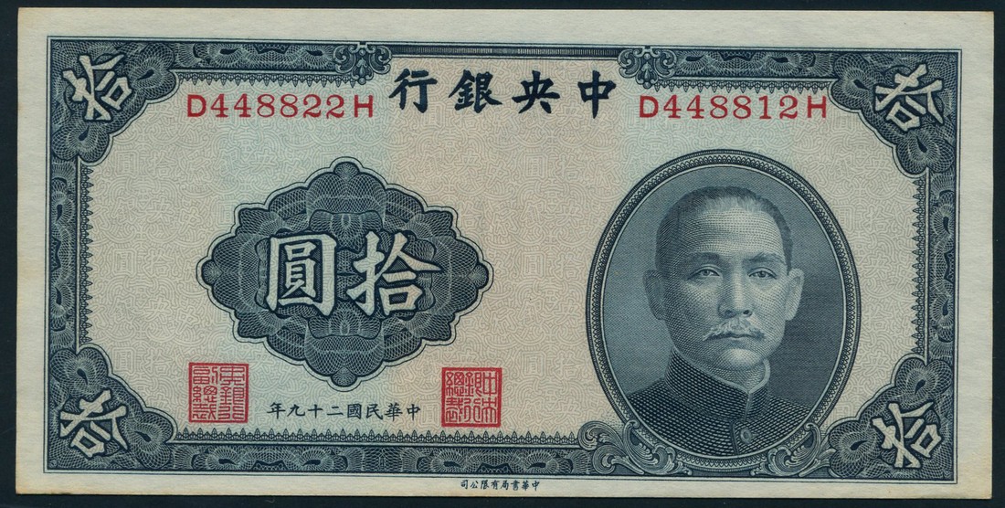 Central Bank of China, 10 yuan, 1940, serial number D448812H/D448822H, mismatched serial numbers, blue gray on multicolour underprint,