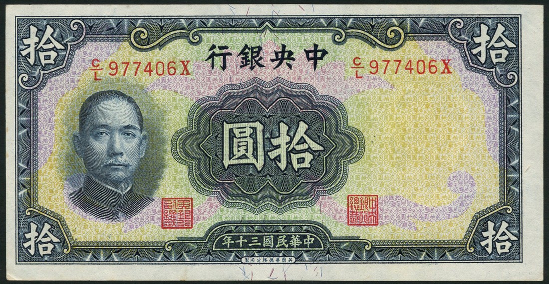 Central Bank of China, 5 yuan, 1941, red prefix A/V, green and pale pink and yellow, Sun Yat Sen at left, also 10 yuan, red prefix C/L, black and multicoloured, Sun Yat Sen at left