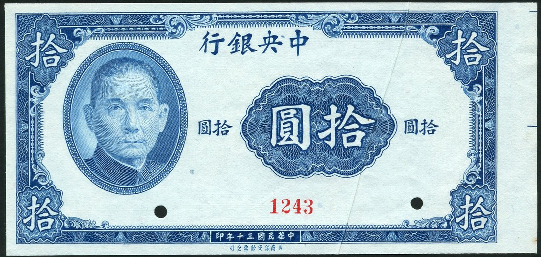 Central Bank of China, specimen 10 yuan, 1941, red serial number 1234, blue and white, Sun Yat Sen at left, reverse green, value, also an reverse uniface specimen of the same type