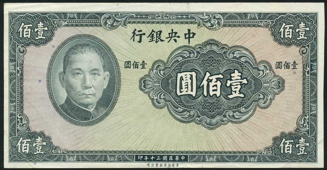Central Bank of China, specimen 100 yuan (2), 1941, obverse and reverse uniface specimen 500 yuan, 1945, red serial number A 000000, black and pale green and another example with colour tint missing, both Sun Yat Sen at left, reverse purple, value