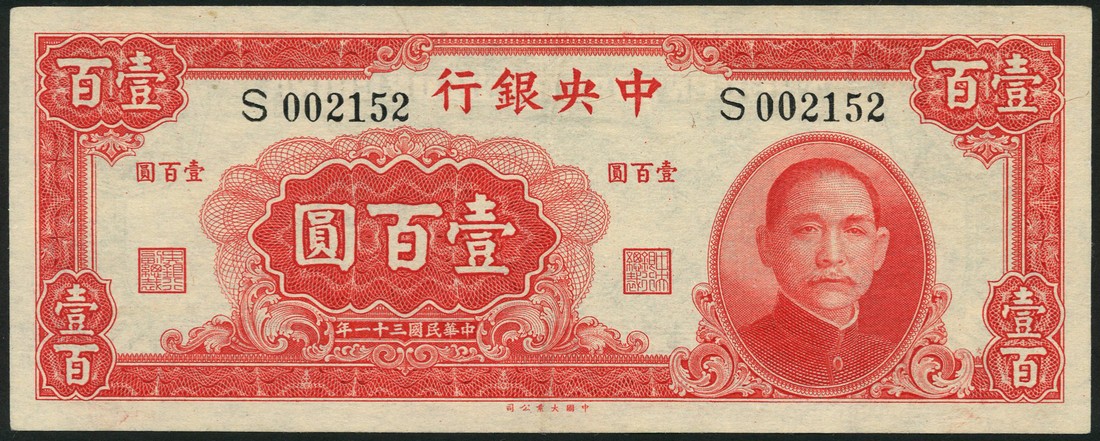 Central Bank of China, 100 yuan, 1942, serial numbers CF182643, S002152 red on light tan, reverse green, a pleasing pair of notes