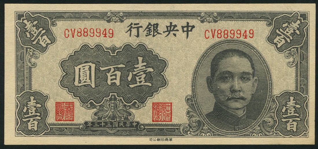 Central Bank of China, 100 yuan, 1944, serial number CV889949, black on yellow green underprint