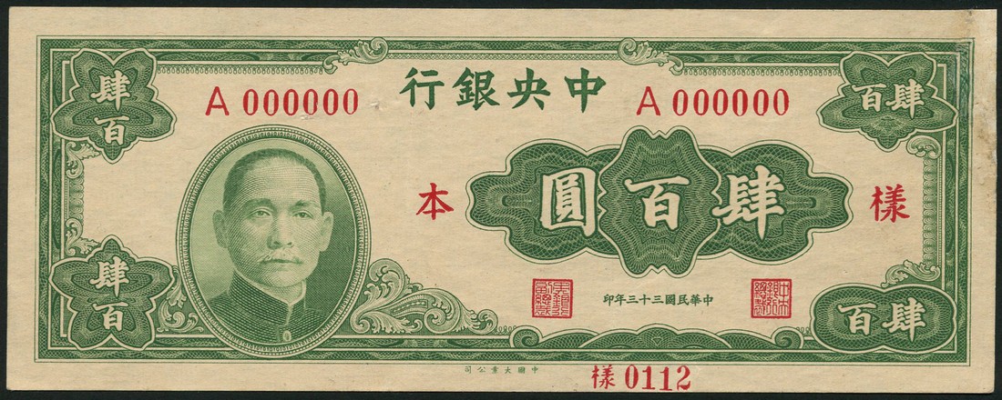 Central Bank of China, an obverse and reverse uniface specimen 400 yuan, 1944, red serial number A 000000, green and white, Sun Yat Sen at left, reverse lilac, value