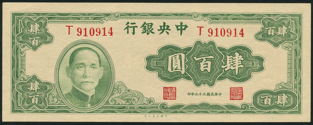 Central Bank of China, 400 yuan, 1944, serial number T910914, green, Sun Yat Sen at left, value at all four corners, reverse brown, value and printed signatures in vignette