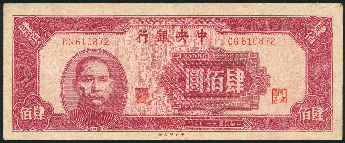 Central Bank of China, 400 yuan, 1945, serial number CG610872, lilac on cream, unusual denomination