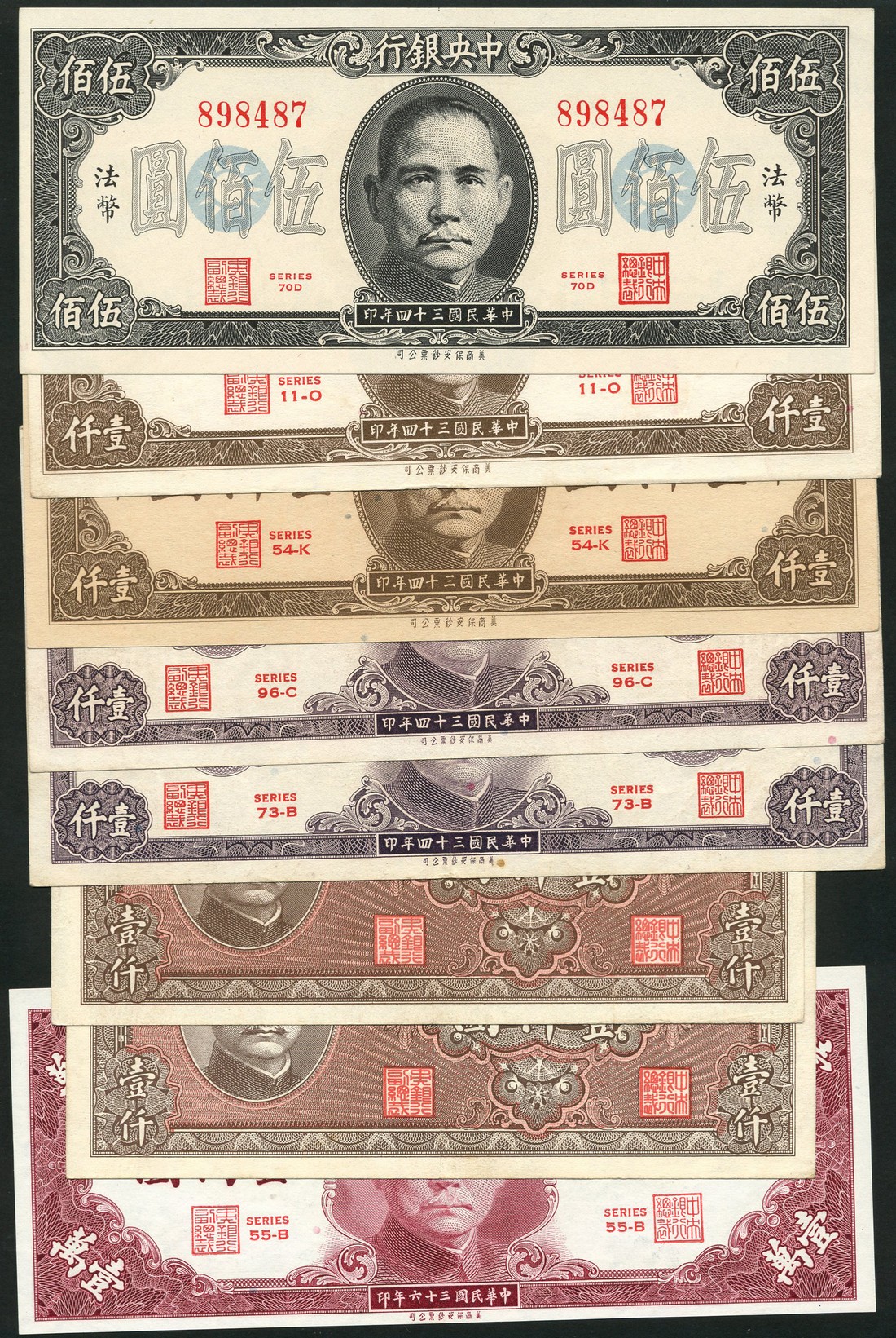Central Bank of China, 500 yuan, 1945, 1000 yuan (6), all 1945, 10000 yuan, 1947, black with light blue national sunbursts in underprint at left and right, brown on cream, purple, reverse sunburst left and right, brown on red brown underprint, red brown