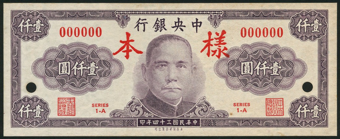 Central Bank of China, an obverse and reverse specimen 1000 yuan, 1945, red serial number 000000, purple and white, Sun Yat Sen at centre, reverse value, radiate sun at left and right