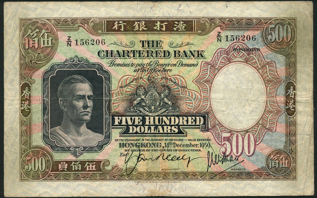 The Chartered Bank, 500 Dollars, 14 December 1959, serial number Z/N 156206, multicoloured, arms at centre, bust of man at left, manuscript signature low centre, reverse purple-brown and green, boats