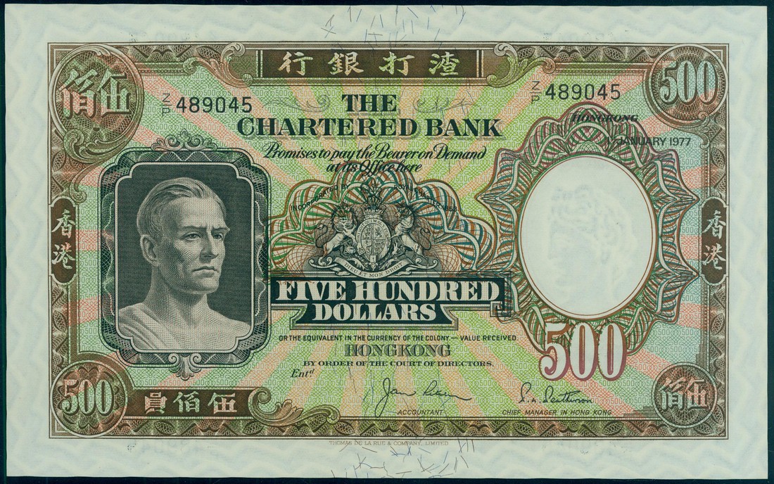 Chartered Bank, $500, 1 January 1977, serial number Z/P 489045, dark brown on green and orange underprint, male portrait at left, arms at centre, value at centre and each corner