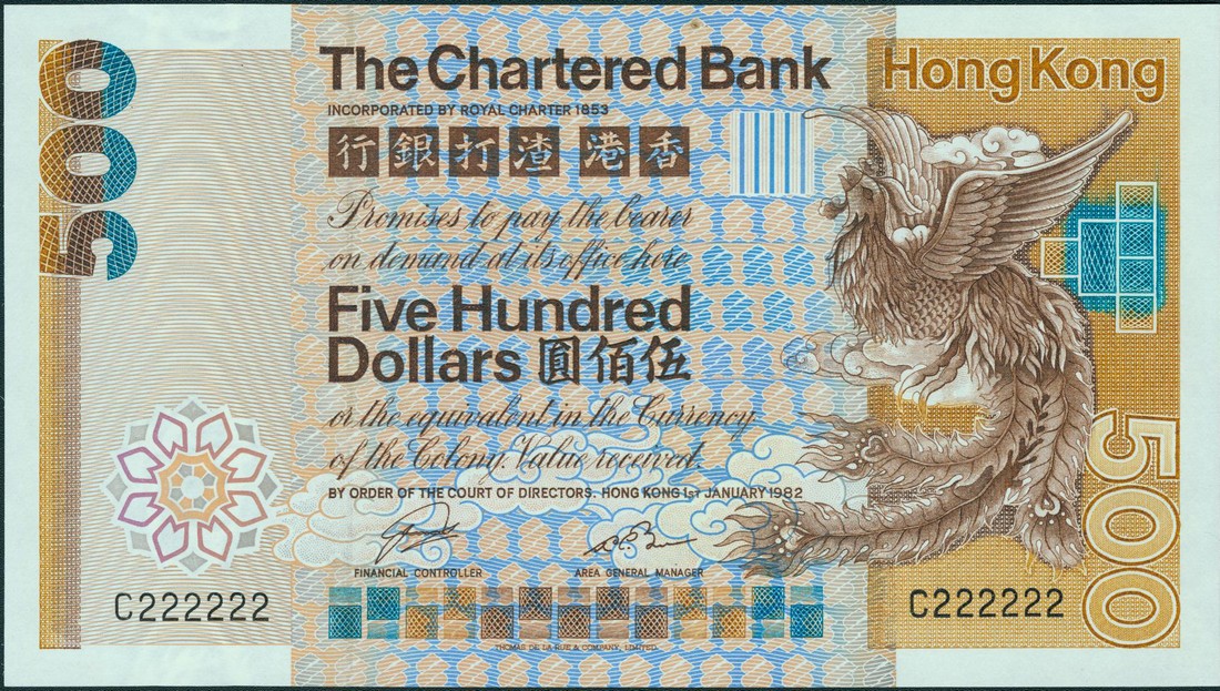 Chartered Bank, $500, 1 Jan 1982, serial number C 222222, brown and multicoloured, phoenix at right