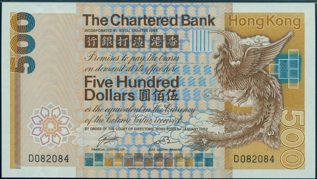Chartered Bank, $500, 1 January 1982, serial number D082084, brown, orange and blue, phoenix at right