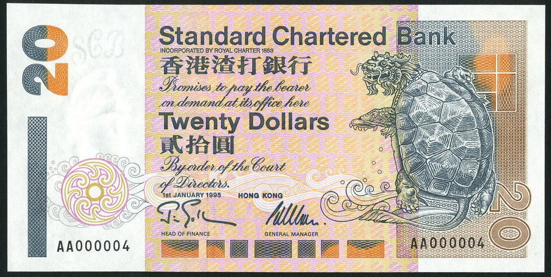 Standard Chartered Bank, $10, 1993 and $20, 1995, both serial number AA 000004, (Ma S17,18a), uncirculated (2)